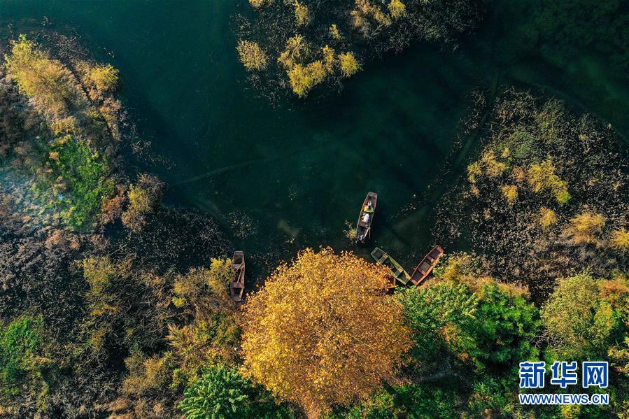 11月10日,小船在阿哈湖国家湿地公园内游弋(无人机照片)。初冬时节,贵州省贵阳市阿哈湖国家湿地公园色彩斑斓,景色怡人。新华社记者 欧东衢 摄