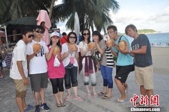 来自台湾台南嘉南药理科技大学、台湾大学、台湾成功大学等大学的32名青年学生和11名海南大学的营员们日前参观三亚蝴蝶谷,踏上了天下第一湾亚龙湾的细软沙滩。