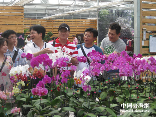 台湾青年创业协会十杰基金会访问团一行高兴地谈论这是“胡总书记今年参观过的兰花品种”。(漳浦县台办 陈文亮 摄)