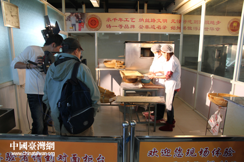 在周村烧饼制作现场,主持人不仅对周村烧饼制作工艺进行了现场采访,还亲身体验了周村烧饼的制作过程,表示要把自己制作的烧饼带回台湾,作为礼物送给父母。