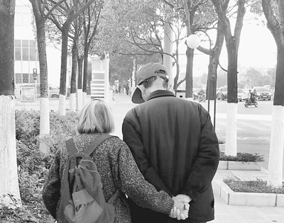 街头相互扶持的老人。