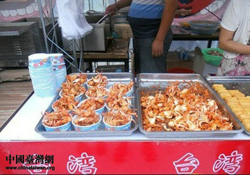 中国台湾网7月4日沈阳消息 日前,台湾小吃蚵仔煎、芙蓉虾、甜不辣、大肠包小肠等台湾特色美食空降沈阳,在著名的沈阳中街步行街迎来了台湾美食节。