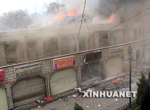 3月14日,拉萨市小昭寺附近的商店正在燃烧。 新华社记者 土登 摄