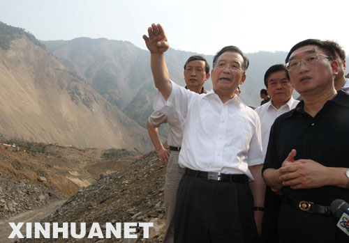 这是温家宝在堰塞坝上实地考察、研究堰塞湖涨水及工程排险办法。 新华社记者刘卫兵摄
