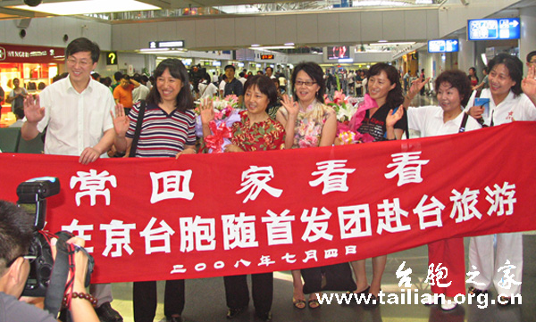 北京市台联副会长叶芳、郑大等人专门到机场为她们送行。当大家拉开写有“常回家看看—欢送在京台胞随首发团赴台旅游”的横幅合影留念时,立刻引来了众多在场的记者和游客们的镜头和关注。