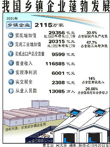 乡镇企业经营范围甚广,包括工业、农业加工、交通运输业、建筑业、商业和饮食服务业等。2002年,全国共有乡镇企业2133万家,从业人员达13288万人,创造增加值3.24万亿元,比上年增长10.32%。