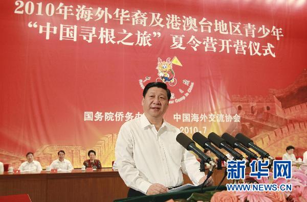 来自世界51个国家和港澳台地区的6000余名华裔青少年25日欢聚北京,参加在人民大会堂隆重举行的2010年海外华裔及港澳台地区青少年“中国寻根之旅”夏令营开营式。中共中央政治局常委、国家副主席习近平出席并讲话,向营员代表颁授营旗。