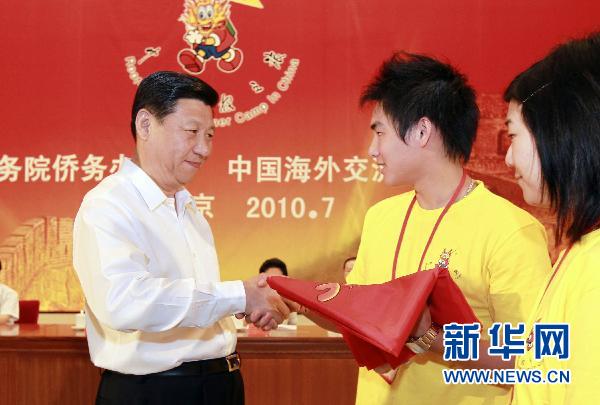 7月25日,中共中央政治局常委、国家副主席习近平在北京人民大会堂出席2010年海外华裔及港澳台地区青少年“中国寻根之旅”夏令营开营式并讲话,向营员代表颁授营旗。这是习近平向营员代表颁授营旗。新华社记者 谢环驰 摄