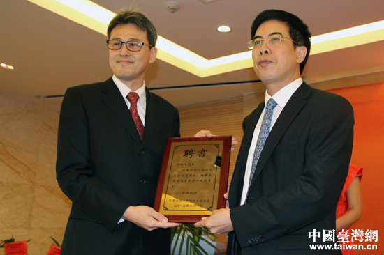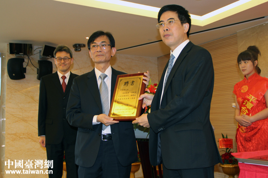 平潭综合实验区管委会副主任陈东荣为当选会长的李云辉颁发当选证书。(中国台湾网 王思羽 摄)