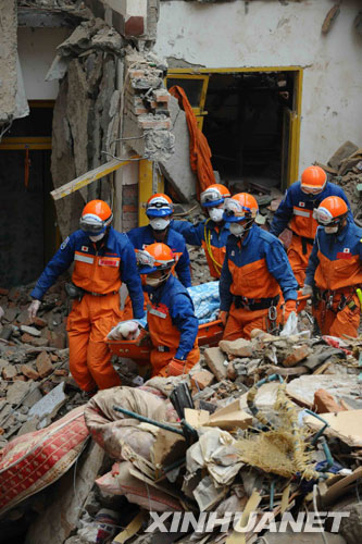 资料图片:5月17日,日本搜救人员将遇难者遗体抬出废墟。当日7时25分,日本救援人员历经16个小时的搜救,在四川青川县乔庄镇一处倒塌的六层楼房废墟中挖出两具遇难者遗体。 新华社记者 李涛摄