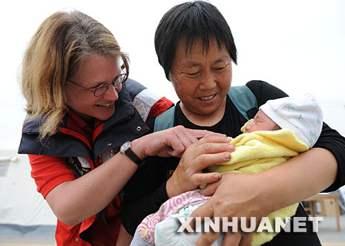 资料图片:德国红十字会的专家斯文佳(左)在四川省都江堰市的中德红十字会野战医院查看一名出生10多天的婴儿的生长情况(5月28日摄)。中德红十字会野战医院由11名德国医疗、技术专家和近百名来自上海华山医院的医护人员组成,设内科、外科、儿科和妇产科,为受灾群众提供医疗服务。连日来,德国专家和中国医护人员配合默契,为地震灾区群众提供医疗服务。新华社记者 蔺以光 摄