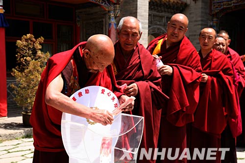 资料图片:5月14日,塔尔寺僧众在为灾区捐款。当日,青海省著名佛教圣地塔尔寺近千名僧侣通过青海省红十字会向四川地震灾区捐款10万元。 新华社记者 杨寿德 摄