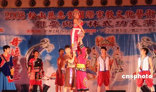 记者十七日下午在台北市重要的宗教场所松山慈惠堂的大礼堂看到,数千市民将礼堂挤得水泄不通。堂主郭叶子介绍,从十六日起,云南艺术团在松山慈惠堂一连五天义演,每天下午和晚上各演一场。