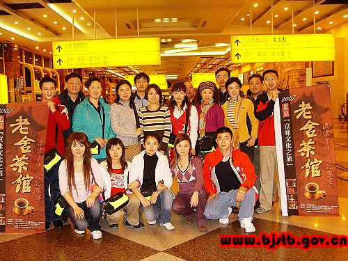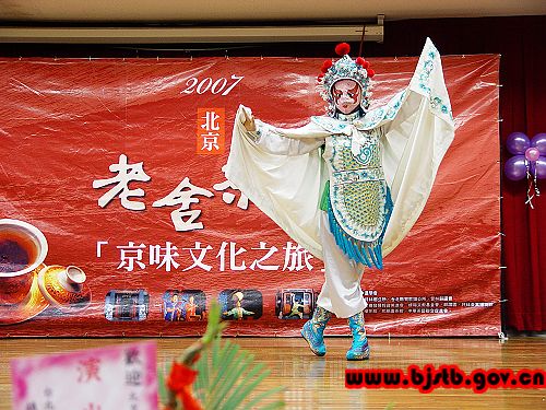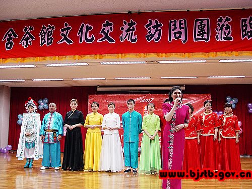 2007年1月2日至11日,由北京老舍茶馆演出人员组成的,集京味文化、茶文化、戏曲文化于一身的第七届“京味文化之旅”展演团,应台湾中华中道学会邀请来到宝岛台湾,先后在云林县虎尾镇布袋戏主题馆、台中耕读园、台北县坪林茶叶博物馆、台北县淡水红楼茶馆、台北紫藤庐茶艺馆和莺歌镇活动中心进行了四场演出和两场交流。老舍茶馆独具浓郁京味、京腔、京韵特色的展演,被誉为“茶与文化艺术的结合”,令岛内民众看得如醉如痴,场场爆满,受到了大批观众的喜爱。很多台湾观众看完演出后意犹未尽,纷纷表示要到北京来看一个“原汁原味的老舍茶馆”。