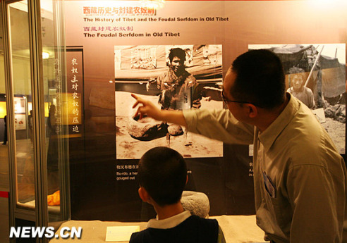 任嘉牧小朋友听大伯跟他讲西藏那过去的事。 由中国国家民族事务委员会等联合主办的《西藏今昔大型主题展》于4月30日在北京开展。展览内容分为西藏历史与封建农奴制度和日新月异的新西藏两个部分,以160件实物和400余张图片向参观者展示旧西藏的落后与黑暗,新西藏的发展与进步。展览将持续至7月25日,并免费向公众开放。新华网 文涛 摄