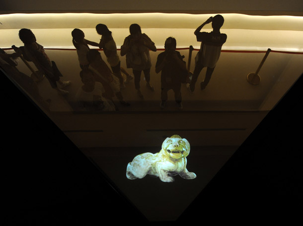 6月27日,游客在震旦馆参观由全息成像技术再现的玉器三维图像。新华社记者 燕雁 摄