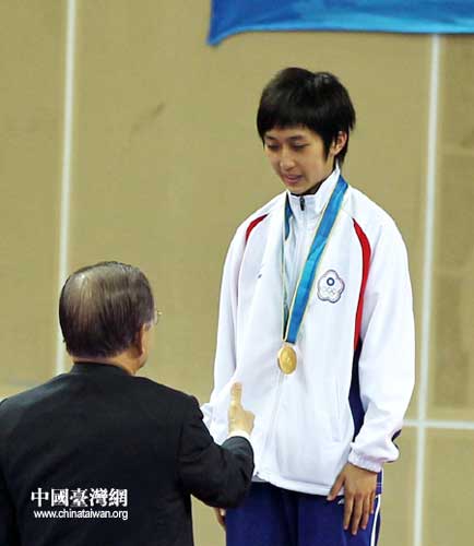 在17日广州亚运会跆拳道女子46公斤决赛中,中华台北队17岁的小将黄显咏为中华台北队再添一金,登上最高领奖台。图为颁奖嘉宾向其竖起拇指表示赞赏。(中国台湾网 钟宝华 摄)