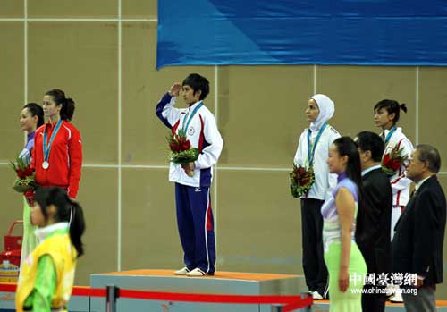 中国台湾网11月18日广州消息 在17日的广州亚运会跆拳道女子46公斤决赛中,中华台北队17岁的小将黄显咏以6:3战胜约旦对手达娜·图兰,为中华台北队再添一金,登上最高领奖台。(记者 钟宝华)