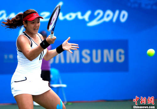 第十六届广州亚运会网球双打决赛11月22日结束,中华台北选手詹咏然/庄佳容获得女双冠军。图为詹咏然击球。 中新社记者 赵振清 摄