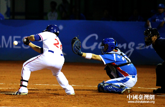 广州亚运棒球决赛今晚进行,中华台北队与韩国队争夺金牌。图为中华台北队击球。(中国台湾网 沈鹏 摄)
