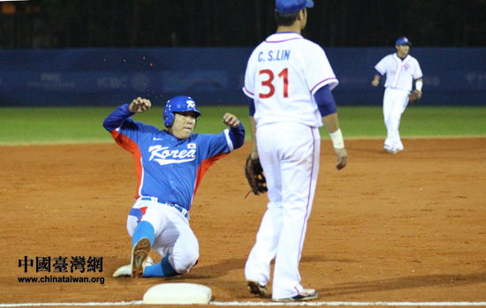 广州亚运棒球决赛今晚进行,中华台北队与韩国队争夺金牌。图为韩国队上垒。(中国台湾网 沈鹏 摄)