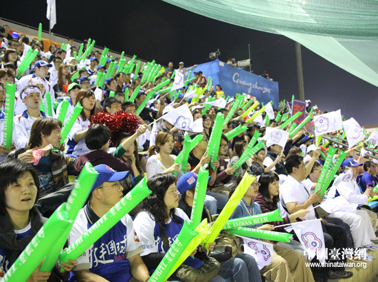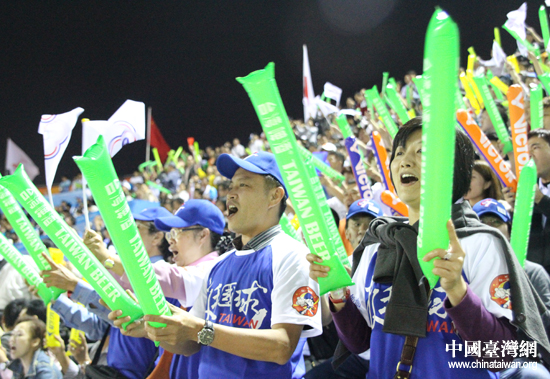 中国台湾网11月19日广州消息 中华台北队今晚与韩国队在棒球场上二度决战,卫冕冠军与传统劲旅的亚运金牌之争吸引了大批观众到场,看台上座无虚席,不但有数百名台湾球迷特意从岛内赶来加油助威,更有大陆观众提前三个小时进场,为台湾健儿打气。