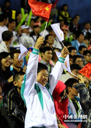 广州亚运棒球决赛吸引了大批观众到场观战。图为给中华台北队加油的大陆小观众。(中国台湾网 沈鹏 摄)
