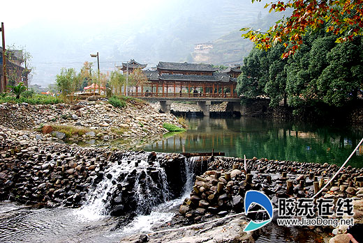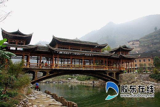 苗寨果然是名不虚传,领教了姑娘们的热情,第二天一早昨夜笼在夜色里的苗寨已全然在记者们的视线之内。放眼望去,整个苗寨依山而建,吊脚楼层层叠叠,顺着山势向上爬,直至第一梯度的山顶。整个苗寨建在两山之间,一条静静流淌着的白水河穿寨而过,将苗寨一分为二,几座风雨桥悠闲地倚在河上。河水碧绿,这在沿海省份是不多见的。在导游的带领下,大家沿着山脚的台阶拾级而上,穿行于吊脚楼之间。据了解,现在不少这样的居民吊脚楼都已得到开发,可提供旅游住宿,让游客最真实地体验苗家生活。当地随行的宣传部门的领导介绍说,吊脚楼是木建筑结构的,建设非常不易,每座楼的建设纯粹依山取势,要在狭小的空间里获得最大限度的生存和居住空间,所以吊脚楼一般都是有一部分是悬空的。看起来虽然危险,但是却非常的结实。这让我们非常叹服苗家人那种征服大山的勇气,也正是这种勇气,再加上苗人的智慧,使得他们的祖先虽然几经迁徙,却仍然保持了独特的苗人文化,坚强不息地代代生存传承了下来。在山顶的观景台,俯瞰整个苗寨,才明白了余秋雨那句话的份量:……生生死死争着往前走,终于走到的一个美丽的终点。这里可以说是一个世外桃源,我们在来的时候,是经历了近一个小时的车程,在荒无人烟的大山小道上几经曲折才来到这美丽的所在。
