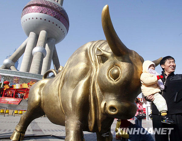 1月24日,游客在上海东方明珠广场的“金牛”前留影。牛年新春前夕,各式各样的“牛”出现在上海街头巷尾。新华社发