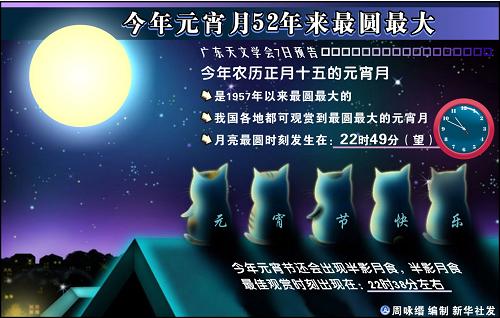 广东天文学会常务理事李建基表示,今年是国际天文年,巧逢52年来最圆最大的元宵月和半影月食同时出现,这种罕见而特殊的天象,人生难得一见。